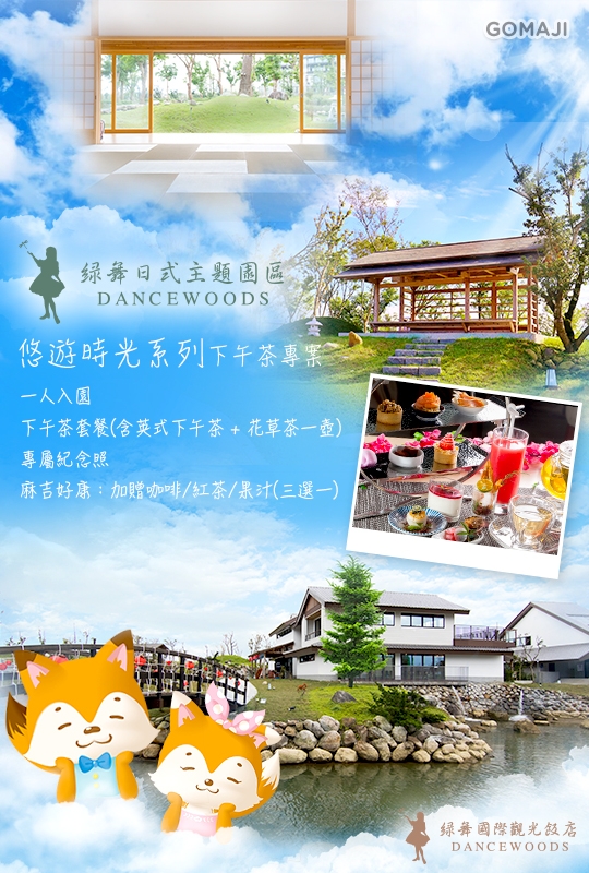 只要799元,即可享有【宜蘭-綠舞國際觀光飯店/綠舞日式主題園區】悠遊時光系列下午茶專案〈含二人入園 + 下午茶套餐(含英式下午茶 + 花草茶一壺) + 專屬紀念照一張〉麻吉好康:加贈咖啡/紅茶/果汁(三選一)